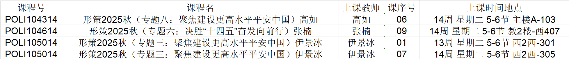 2025-2026学年第一学期2025级本科生“形势与政策”第1轮选课已结束,下列课程选课人数少于规定要求,予以停开。