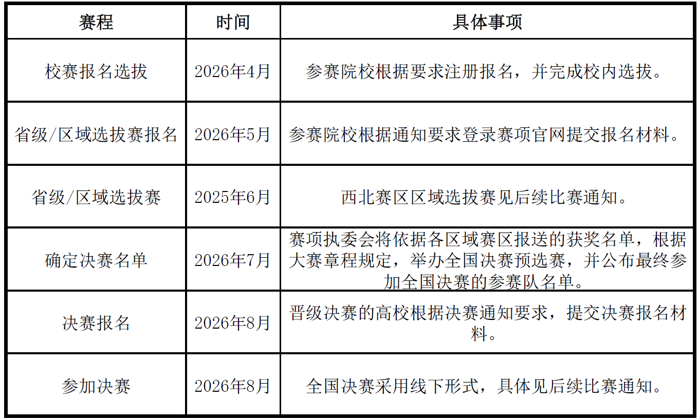 1.赛程:大赛采用校级、区域(省)级选拔赛、全国赛三级赛制。2026年赛程预估时间如下,具体时间见后续比赛通知。